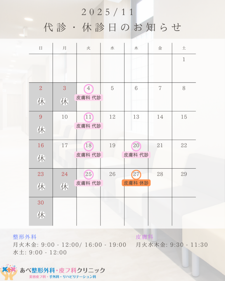 皮膚科代診日 1(火)、10(木)、14(月)、15(火)、17(木)、25(金)