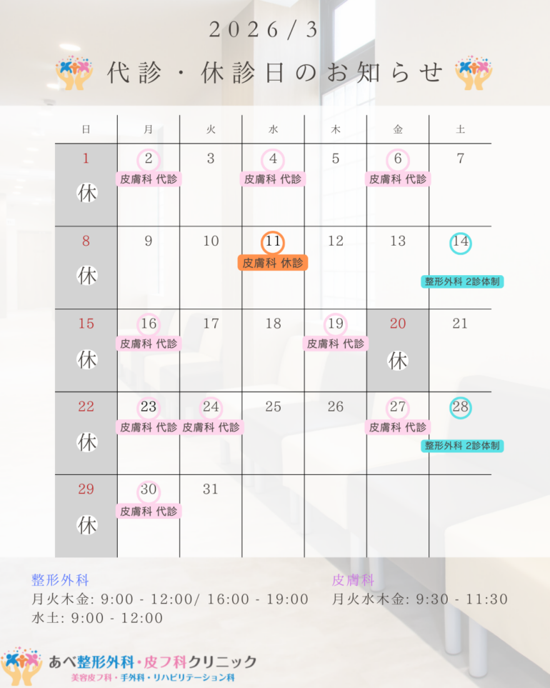 3月の皮膚科代診日のお知らせです。皮膚科休診日が発生しましたのでご注意ください