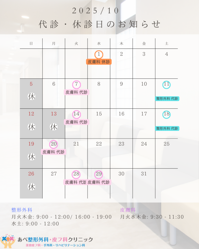 10月皮膚科臨時休診日と代診日のお知らせ(変更)